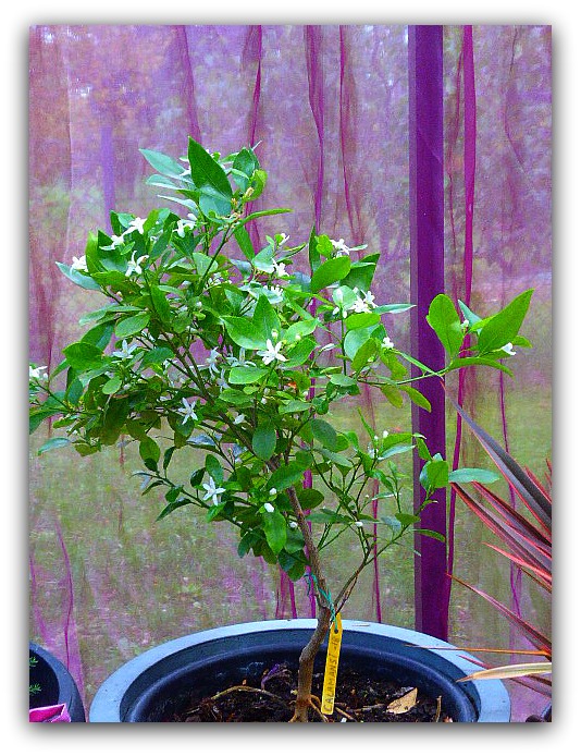 Bredvid Rolle ser man det lilla filippinska limeträdet (Calamansi) som en trädgårdsvän tog med sig på flyget hit till mig som gåva förra våren. Mycket snällt! Det har nu börjat växa till sig och dessutom fått massor av blommor, så jag ser fram mot massor av frukter också!!