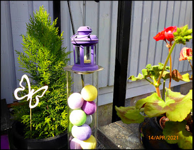 | Ytterligare en pelargon från Jonas och sen en barrväxt jag köpte i Skåne på semestern 2019. Där emellan lite dekorationer. Fjärilen - plus en röd likadan - har jag fått av mina bloggvänner i Tyskland. |