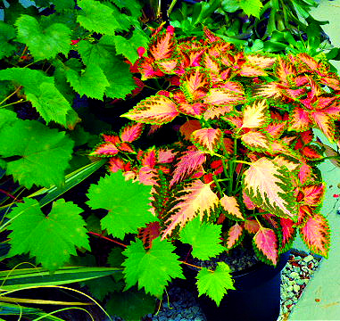 ...vilket alla pelargoner verkar göra. Det till höger är ett av dom två penningbladen jag hade ute och allt det andra gröna är vindruvsblad - för dom har naturligtvis växt enormt nu när jag inte beskurit dom!