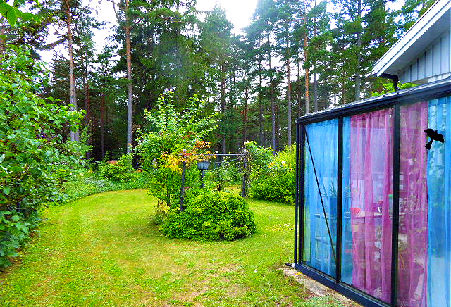 | Det blir väldans varmt i växthuset eftersom det är byggt på södra sidan, så det behövs gardiner mot solen. SUSIE |